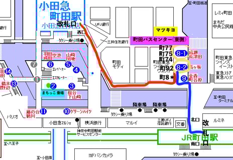 町田駅のバス停は、「町田バスセンター(東側)」東急ツインズの間のマツキヨに続く道に並ぶ8番乗り場か、9番乗り場。