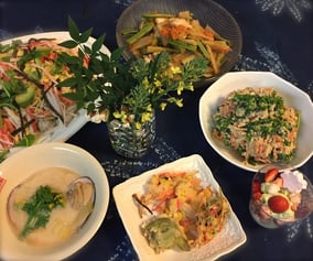 思春期アボガドちらし寿司、春の彩りかきあげ、菜の花の白あえ、山菜(うど、こごみ)花イカの人参マスタードあえ、白貝の豆乳お吸もの、ひなあられパフェ…10代〜50代の楽しいゴハン&美味しいトーク。