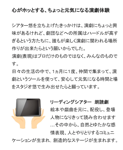 メンバーが持ち寄った6作品の朗読をオムニバスにして、おもハモ楽団の演奏とつなげたシアター(33分)